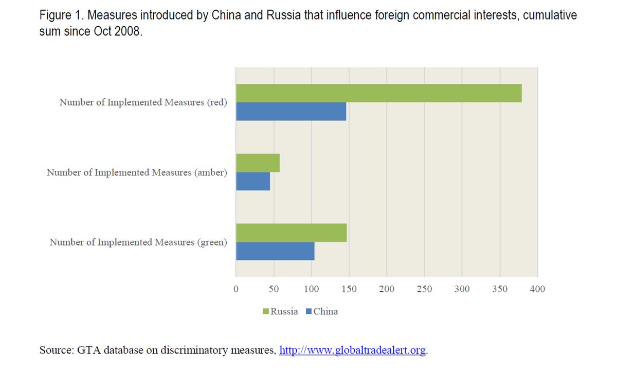 Lontano da queste cifre insensate, osservo un paio di notizie che mi fanno capire come, aldilà dei fantastiliardi, siano all’opera movimenti profondi in uno dei mercati più caldi del momento: quello petrolifero. Sempre Bloomberg riporta l’opinione di un pezzo grosso dell’IEA, l’agenzia internazionale dell’energia, che spiega come l’accordo Opec di novembre, se mai arriverà, sarà un toccasana per i corsi petroliferi e perciò farebbe un gran bene ai produttori Usa di shale, che si sono inguaiati dopo il crollo delle quotazioni. E poiché la Russia sarà la grande protagonista, insieme all’Arabia Saudita, di questo accordo, vale la pena anche sottolineare uno studio secondo il quale proprio la Russia, insieme con la Cina, si è distinta per un alto numero di pratiche discriminatorie del commercio estero. Ecco il grafico: