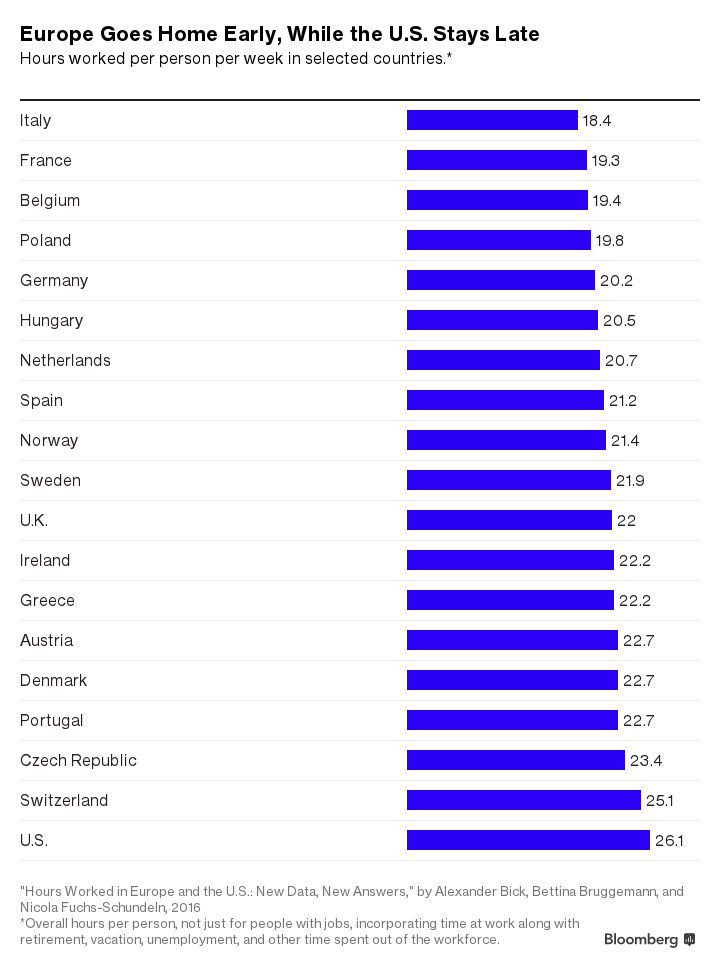 Ma la notizia migliore la trovo sfogliando una ricerca pubblicata nell’agosto scorso da tre economisti, un americano, una canadese e una tedesca, che sembra una barzelletta. I tre hanno svolto un’analisi su dati relativi al periodo 1983-2011 per scoprire che gli Europei lavorano in media il 19% di ore in meno rispetto agli statunitensi. E’ divertente osservare che noi italiani, come illustra questo grafico preso da Bloomberg, siamo considerati fra quelli che lavorano meno di tutti.