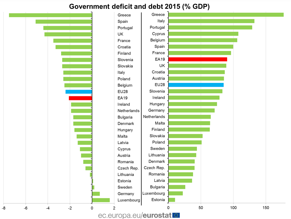 E siccome è venerdì ed Eurostat c’ha fretta di chiuder bottega, ecco che arriva a inizio mattinata, la notifica del debito e del deficit per Ue ed eurozona: l’uno e l’altro per l’una e l’altra sono previsti in calo rispetto al 2014. E’ un bel momento per il memento. E la Commissione Ue è talmente felice che produce questo disegnino: