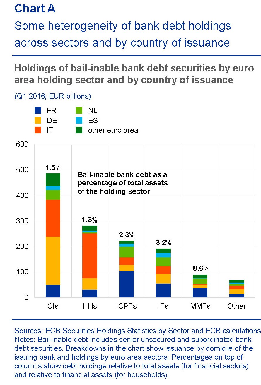 Ci metto un po’ finché non capisco che il trucco era tutto negli acronimi. Il grafico riguarda il debito potenzialmente soggetto a bail in, ossia sequestrabile in caso di crisi bancaria, emesso dalle banche europee che ancora ci intossica di preoccupazioni. I vari istogrammi sono i soggetti che detengono questo debito. Il primo, quello più alto sono le banche (CIs). Il secondo le famiglie (HHs). Quelle arancioni sono le famiglie italiane. Cosa viene fuori? Che le famiglie italiane sono quelle che hanno più debito sequestrabile dal bail in in Europa. E che le banche italiane pure, insieme a quelle tedesche.