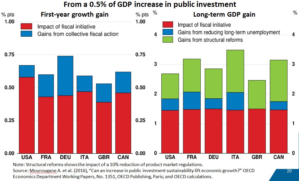 Il pezzetto in rosso è il contributo di cui il mondo godrebbe qualora Trump facesse quanto ha detto, ossia stimolasse fiscalmente l’economia. Pratica che malgrado il suono vagamente sconcio, conferma l’innamoramento dell’Ocse per lo spazio (fiscale) del quale il Cronicario vi ha già raccontato.