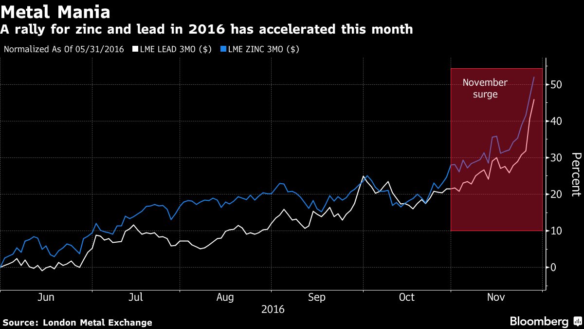 Lato commodity, anch’esse miracolate da Trump e dalle sue promesse espansive, vi segnalo questo pregevole articolo di Bloomberg che allunga un’altra fila: quelle delle materia prime in rialzo esagerato. E’ successo al rame, ora è il turno dello zinco e del piombo.