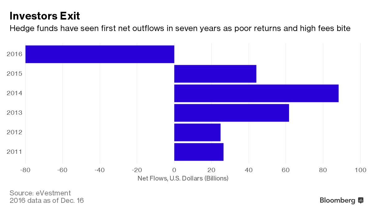 Stanco di spaventarmi, lascio le vicende di casa nostra ed emigro oltre oceano. E che ti trovo? Bloomberg, sempre per la serie timori e tremori, ci svela che il 2016 è stato un anno nero per gli hedge fund, i grandi distruttori, le locuste della finanza, come ebbero a definirli, che hanno subito deflussi da 80 miliardi che per un’industria che ne vale tremila non è poco ma neanche tanto.