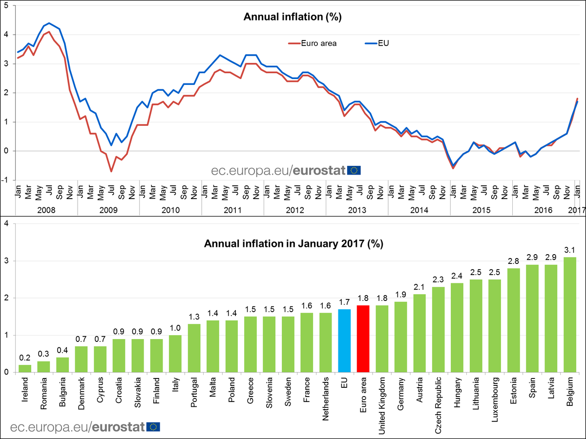 L’Istat infatti ha confermato che a gennaio 2017 i prezzi sono saliti dell’1% su base annua, in aumento rispetto alla stima dello 0,9, raddoppiando rispetto a dicembre. Poi vi diranno che c’è inflazione e inflazione: quella di fondo, quella armonizzata, quella di Pippo, Pluto e Paperino. Rimane il fatto che aumentano tutte, chi più chi meno. E questa seccatura farà sicuramente piacere a chi ha debiti, a cominciare dal governo, un po’ meno a chi ha comprato i BtP all’unovirgola di qualche tempo fa.