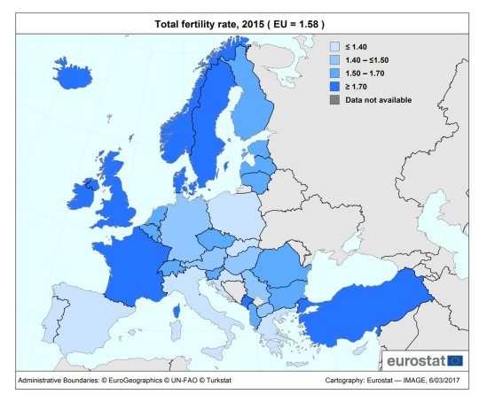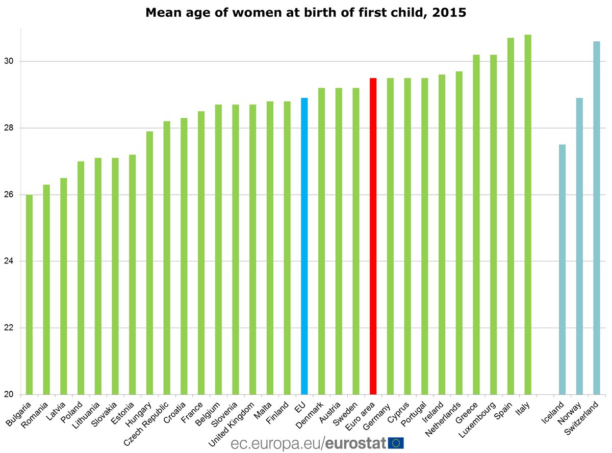 Per chi non lo sapesse, il fertility rate misura il numero medio di figli di una donna in età fertile. E siccome ancora oggi per fare i figli servono almeno due persone, se una donna ne fa meno di due vuol dire che il saldo demografico è negativo. In sostanza la popolazione diminuisce. Quanto all’età, queste sono le medie della prima gravidanza. Noterete che le donne italiane sono le più tardive.