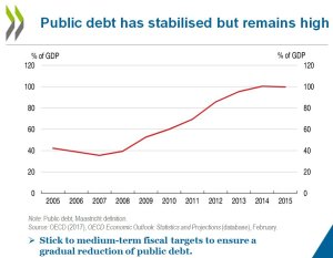 ma ancora i benefici si vedono poco sul versante dell’occupazione e del livello generale dei debiti, pubblici e privati, ancora molto elevati.