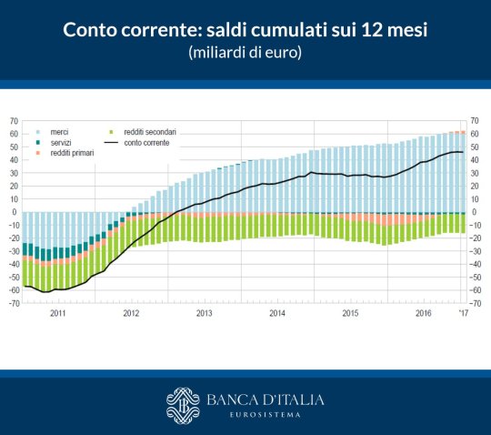 Intanto che aspettiamo il nuovo medioevo, consoliamoci con le buone notizie che ogni tanto arrivano. La prima ce la restituisce sempre Bankitalia, che con balzo atletico passa dalla storia alla contabilità pubblicando le statistiche sulla bilancia dei pagamenti che mostrano un saldo attivo crescente del nostro conto corrente, arrivato a cumulare 45,9 miliardi – il 2,7% del pil – a gennaio 2017.