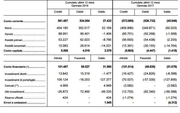 Intanto che aspettiamo il nuovo medioevo, consoliamoci con le buone notizie che ogni tanto arrivano. La prima ce la restituisce sempre Bankitalia, che con balzo atletico passa dalla storia alla contabilità pubblicando le statistiche sulla bilancia dei pagamenti che mostrano un saldo attivo crescente del nostro conto corrente, arrivato a cumulare 45,9 miliardi – il 2,7% del pil – a gennaio 2017.