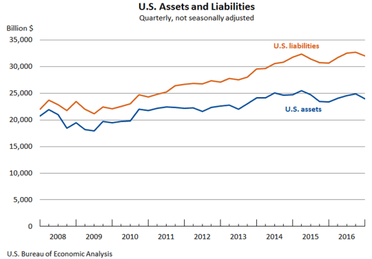 La prima che trovo riguarda gli Usa la cui posizione netta degli investimenti esteri, ossia il saldo fra il valore dei loro investimenti all’estero e quello degli investimenti esteri negli Usa è arrivata ad essere negativa per 8.109,7 miliardi di dollari.