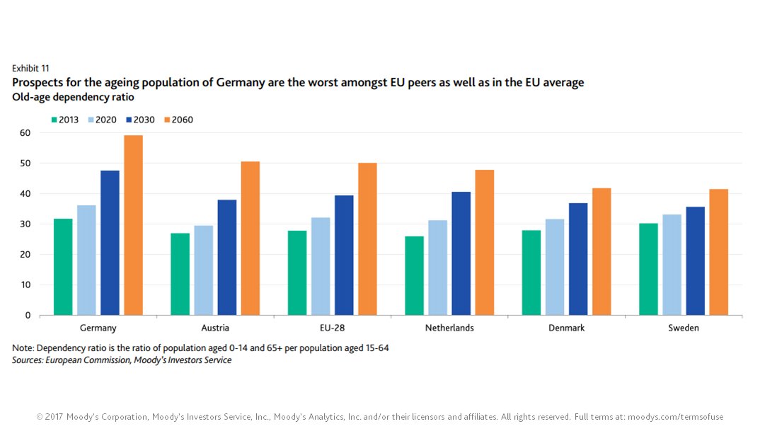 L’agenzia di rating ha calcolato l’old age dependency ratio, indicatore che misura il tasso di dipendenza degli anziani dal resto della popolazione, e quindi indirettamente il loro peso specifico, notando come la Germania sia quella messa peggio fra i suoi pari. Nel 2030, quindi fra meno di 15 anni, il tasso sfiorerà il 50%, che significa che ci sarà quasi un anziano ogni due abitanti, e nel 2060 si andrà verso il 60%, ossia due anziani ogni tre abitanti. La Germania diventerà una casa di cura a cielo aperto. E non sarà l’unica.
