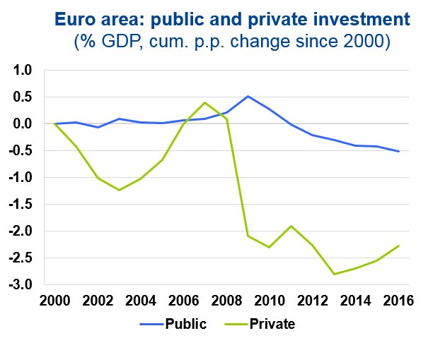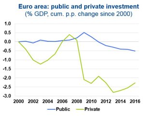 Gli investimenti fiacchi dell’eurozona. Il capo economista dell’ESM, il fondo europeo di stabilità, Strauch ha osservato di recente che il livello degli investimenti è un punto critico per recuperare un livello di crescita soddisfacente in futuro, specialmente relativamente al settore privato, che ha conosciuto un notevole crollo dopo la crisi del 2008. Quest’affermazione è stata accompagnata da un grafico che mostra l’andamento degli investimenti privati e pubblici nell’eurozona fra il 2000 e il 2016.