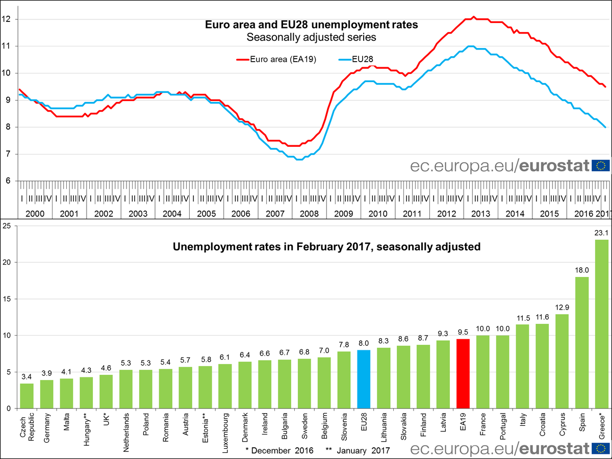 Numero del giorno: 9,5 Tasso di disoccupazione nell’EZ a febbraio 2017