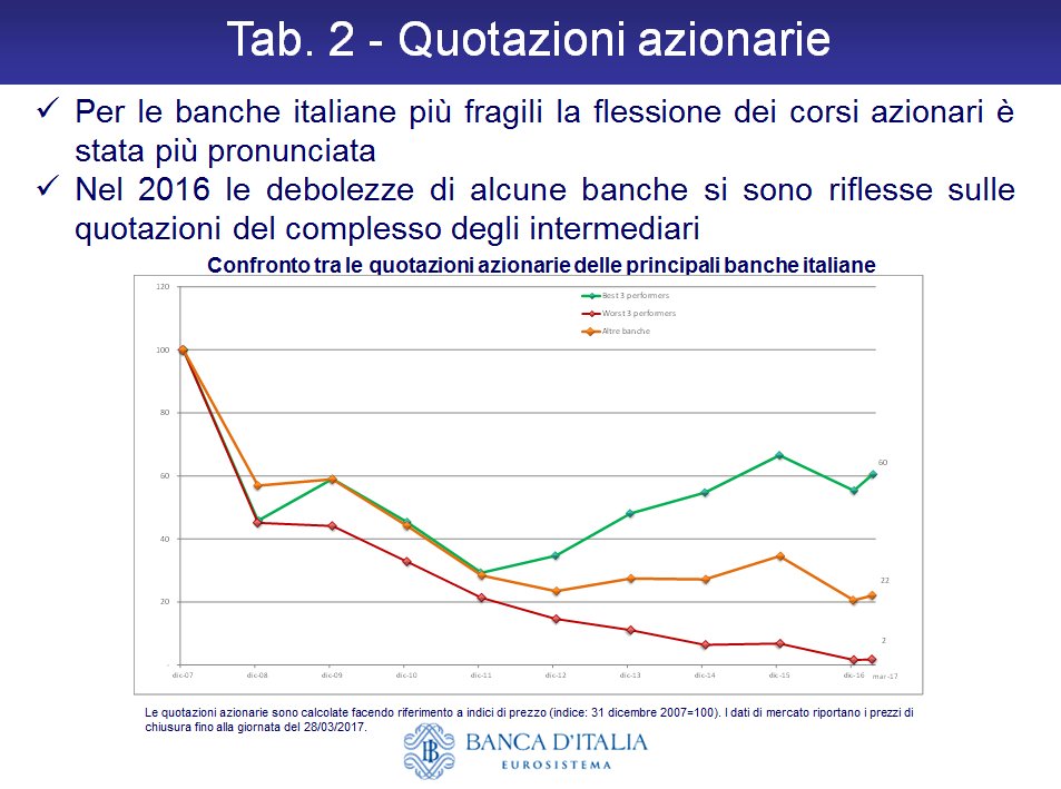 Il resto della giornata si segnala per un pregevole intervento del capo della vigilanza di Bankitalia Carmelo Barbagallo che contiene alcune informazioni interessanti sulle nostre banche e su come abbiamo vissuto i peggiori anni della loro vita La prima – ma ce n’eravamo accorti – è che alcune banche hanno affossato le quotazioni di tutte le banche.