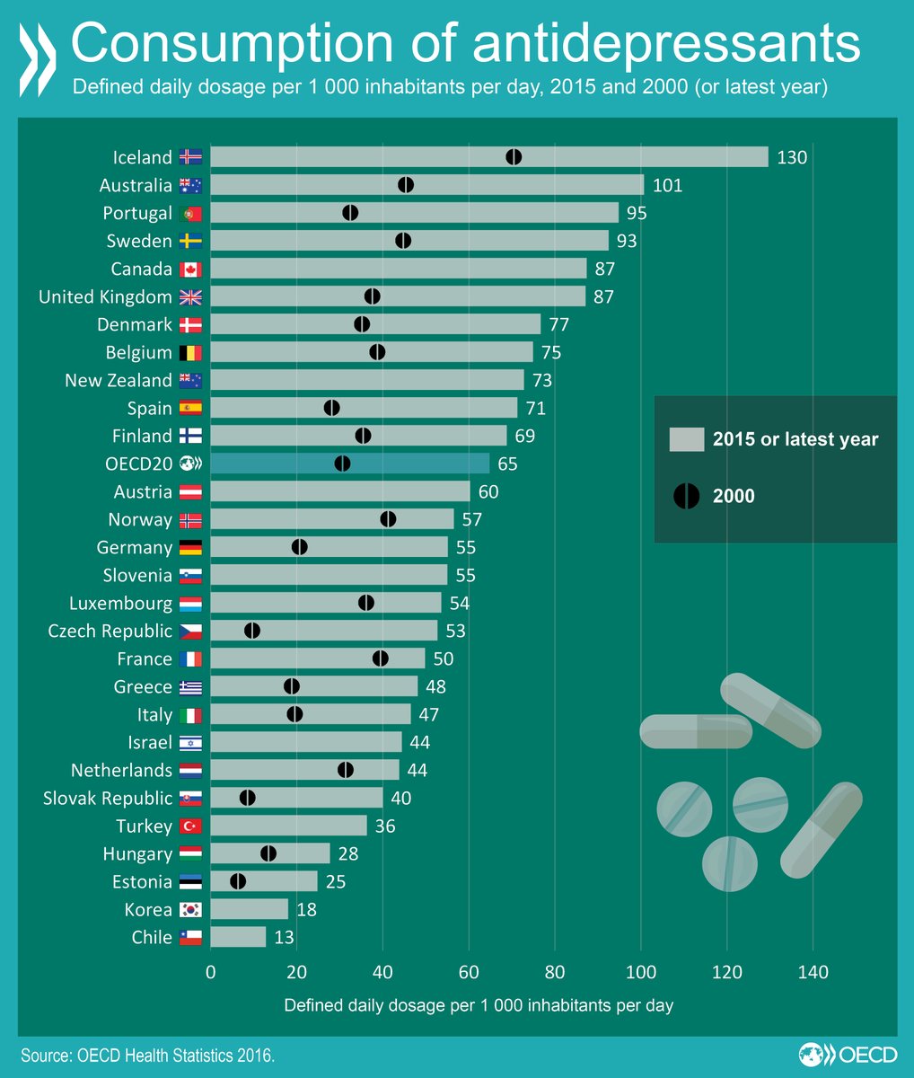 Come si vede dal grafico, anche noi italiani siamo messi abbastanza bene, a conferma del fatto che le difficoltà economiche – e la Grecia e Cipro ne hanno viste assai peggiori delle nostre – non sempre – o almeno non subito – hanno impatti sul benessere autentico della popolazione. Sempre la Grecia, ad esempio, si segnala per un numero moto basso, il 4,7%, di persone che soffrono di depressione e sta in coda alla classifica preparata da Ocse per il consumo di antidepressivi. In testa ci stanno gli Islandesi.