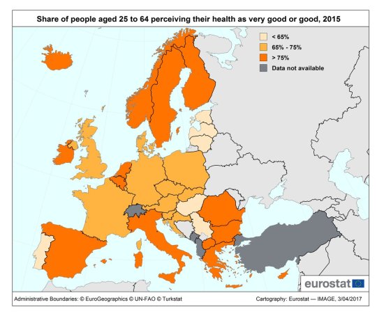 Poveri ma sani. La settimana scorsa, in occasione del World Health day, diversi istituti hanno rilasciato alcune informazioni interessanti che servono anche a sfatare alcuni luoghi comuni. Una di queste, rilasciata da Eurostat, dice che Grecia e Cipro sono i paesi con il maggior numero di cittadini che dice di avere una salute buona o molto buona, pari all’85% dei 15-64enni.