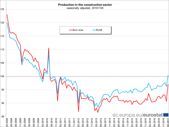 Sedotto dal pugno d’acciaio di Mister T, capirete bene che ogni altra nuova scolorisca. M’impongo di tornare serio solo perché intanto Eurostat ha rilasciato il suo aggiornamento sul settore delle costruzioni, la cui produzione, per quanto in risalita, è ancora ben lontana dai giorni di gloria.