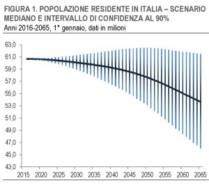 Non state a diventare ciechi notando le sfumature neroazzurrine delle lische: quelli sono gli intervalli di confidenza, ossia il margine di approssimazione delle previsioni, laddove la linea dritta è la previsioni vera e propria. Per farvela semplice, Istat prevede che nel 2065 la popolazione italiana sarà di 53,7 milioni di persone, 2,1 milioni in meno rispetto all’anno scorso, ma con un minimo che potrebbe raggiungere i 46,1 milioni, mentre la probabilità che aumenti è pari al 7%.