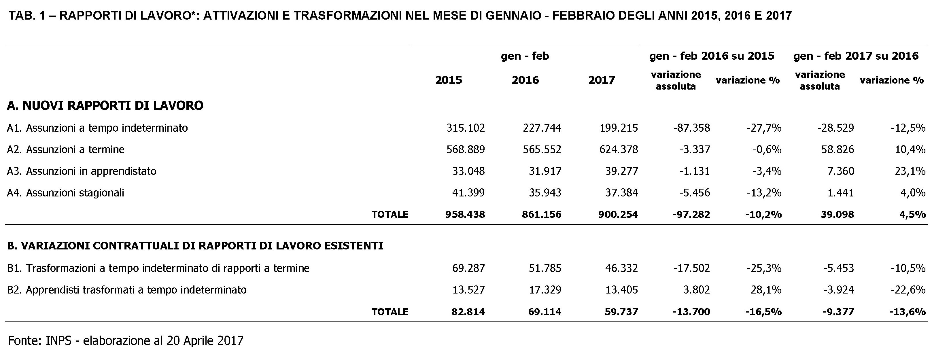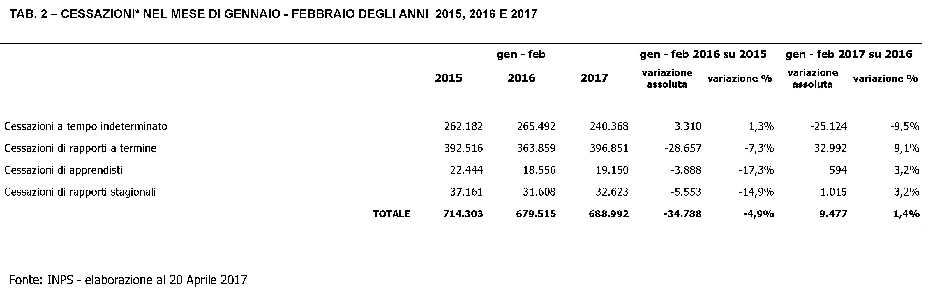 Notate la finezza, che si estrinseca nella costante diminuzione dei rapporti a tempo indeterminato, dai 315.102 del primo bimestre 2015 ai 199.215 del primo bimestre 2017 (-36%) e nel costante crescere di quelli a tempo determinato, cresciuti da 568.889 a 624.379 (+9,75%) e quelli di apprendistato, da 33.048 a 39.277 (+18%). E poiché le trasformazioni da contratti precari a tempo indeterminato diminuiscono anch’esse, rispettivamente dell’8,5% fra il 2016 e il 2015 e di un ulteriore 11,8% fra il 2016 e il 2017, non si può che dedurne che aumentino le cessazioni a termine. E guarda un po’, è davvero così.