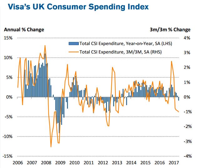 A proposito, si è fatto tardi. Prima di salutarvi, vi sottopongo l’ennesima suggestione britannica: il calo della spesa per consumi che per la prima volta negli ultimi quattro anni è calata.