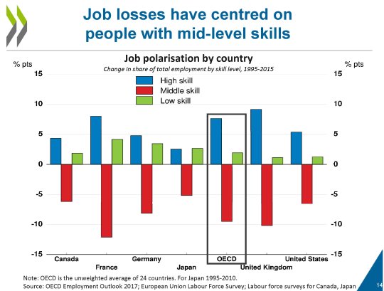 Come si può osservare dal grafico le perdite di impiego maggiore l’ha subita la classe dei lavoratori mediamente qualificati. Né i low skilled né gli high skilled, che bene o male nel ventennio considerato, ossia fra il 1995 e il 2015, sono cresciuti. Il crollo della classe media, che così tanti fiumi di inchiostro ha generato, è il crollo della professionalità media. Al mercato queste persone evidentemente non servono più.