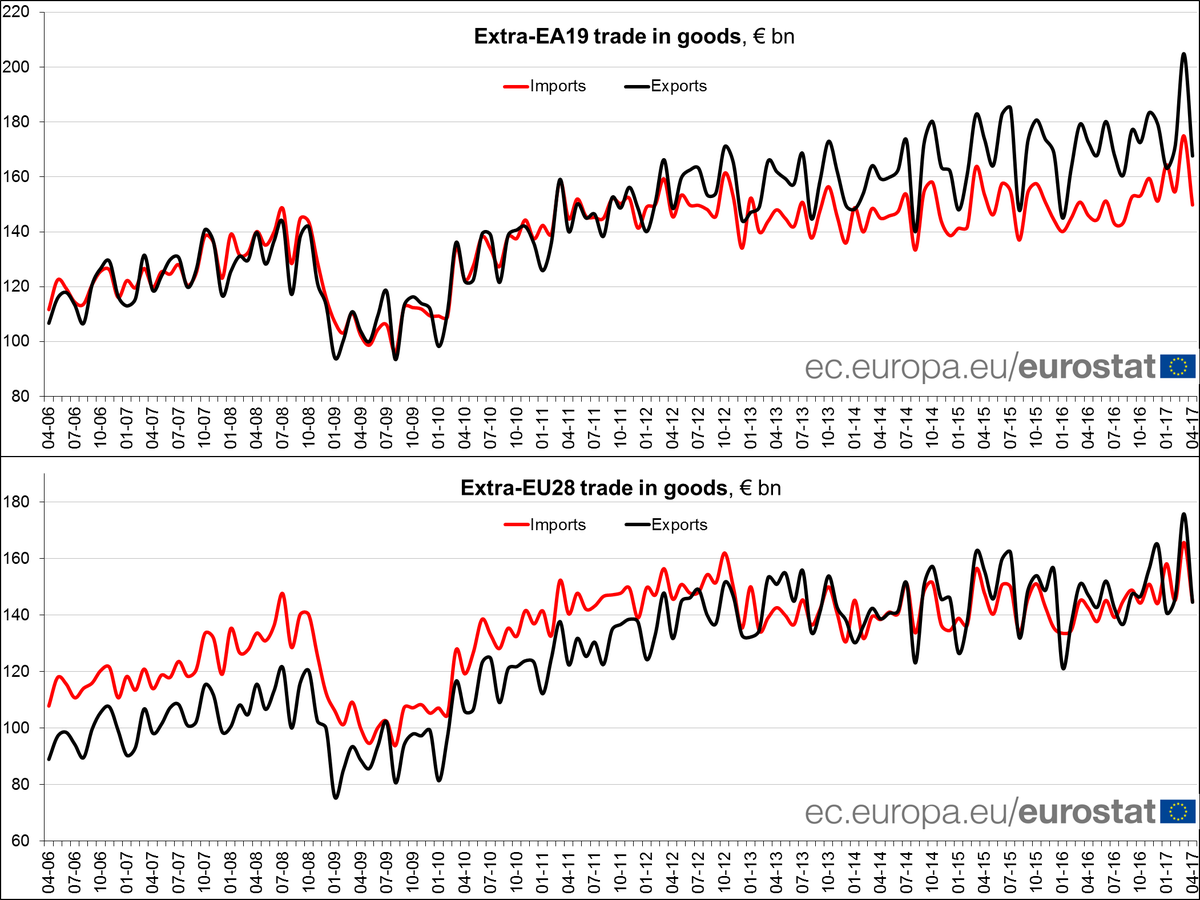 ha un surplus per l’EZ di 17,9 miliardi ad aprile e un deficit di 0,1 miliardi per l’Ue a 28. E chi ha orecchi intenda.