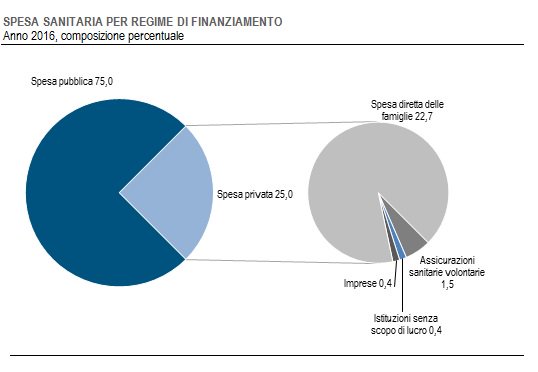 Lascio il Genio al lavoro perché voglio concludere con un’altro conteggio stavolta dell’Istat che ha dissezionato il sistema dei conti sanitari italiani. Viene fuori che la spesa sanitaria totale in Italia è pari a 149,5 miliardi, pari all’8.9% del Pil. Questa spesa viene sostenuta per il 75% dallo Stato – di cui la metà solo gli ospedali – il resto dal privati, che quindi spendono circa 37 miliardi l’anno per curarsi.