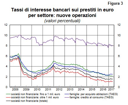 Credito italiano? Solo per chi può La Banca d’Italia ha diffuso le statistiche sull’attività bancaria che ci consentono, incrociandole, di avere un’informazione molto interessante. In sostanza, il credito costa più caro alle famiglie che alle imprese e ciò malgrado (o forse proprio per questo) la crescita più rilevante delle erogazioni è per le famiglie e non per le imprese. Tutto ciò è osservabile guardando il grafico del costo dei prestiti, misurato dai tassi di interesse, e quello dell’andamento del credito.