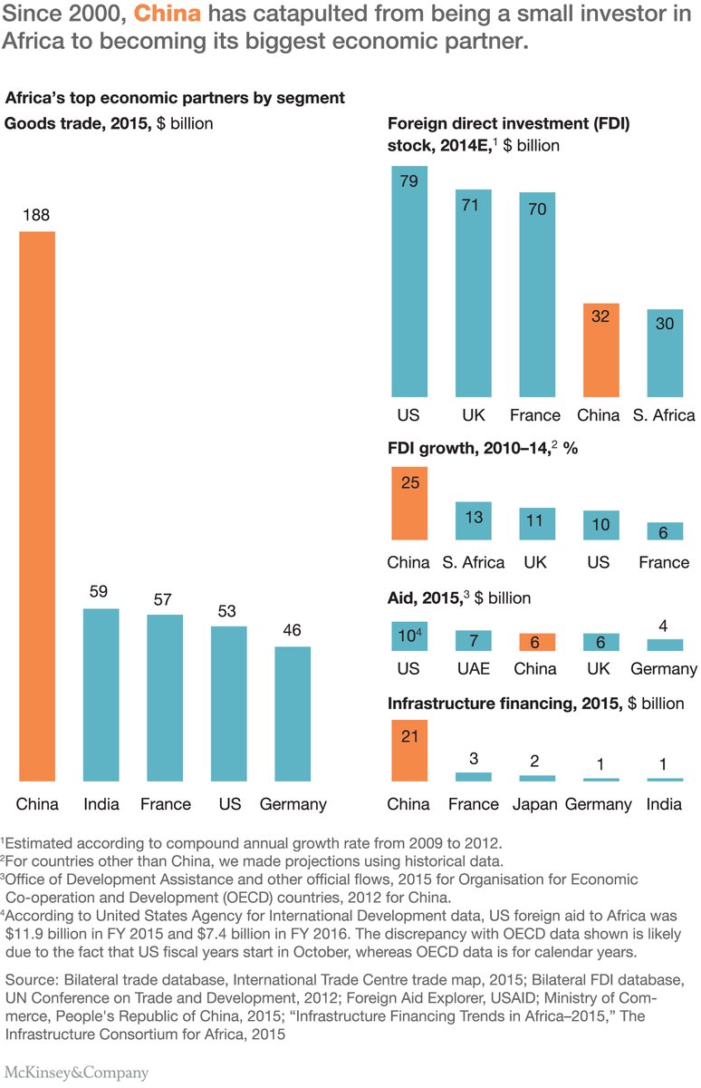 Ai cinesi piace l’Africa. Un’analisi di McKinsey mostra il ruolo crescente che la Cina sta giocando nel continente africano. Se ne parla da tempo, ma se si guardano i grandi numeri non si può che rimanere colpiti dal grande progresso dei cinesi nelle relazioni bilaterali con l’Africa, che a dispetto della vulgata. È un paese molto ricco, in risorse naturali e materie prime. Ecco una scheda che mostra come i cinesi, nello spazio di un ventennio, siano diventati i primi partner per scambi bilaterali.