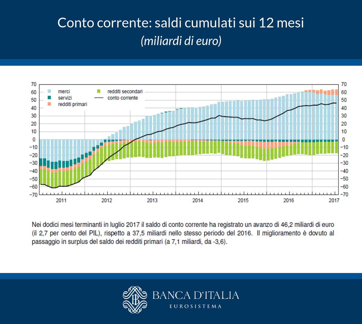 Leggo la nota a pie’ di disegnino e scopro che ad addrizzare il saldo ci hanno pensato i redditi primari migliorati di una decina di miliardi fra luglio 2016 e luglio 2017.