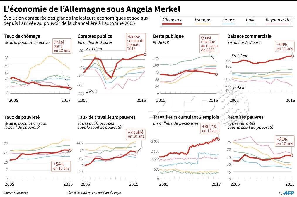 a manifestare la circostanza che a fronte dei risultati lodevoli della prima riga, campeggiavano, a disdoro di 12 anni di Merkel, gli esiti infausti della seconda. Tassi di povertà in aumento, lavoratori poveri in aumento, lavoratori che cumulano due stipendi in aumento, eccetera. Come dire: il miracolo tedesco ha un lato oscuro che la narrazione ufficiale degli amici della Germania nasconde. Ed ecco perché l’est tedesco, tuttora alquanto disgraziato, ha votato per AfD. Facile: è l’economia stupido.