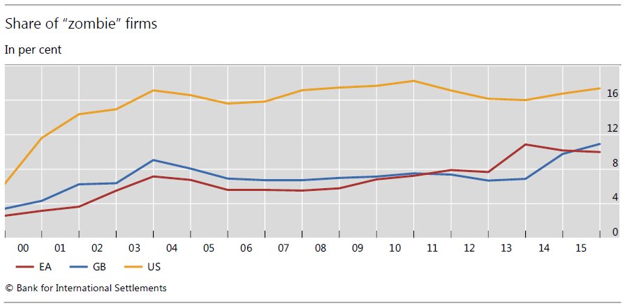 L’irresistibile aumento degli zombie La Bis, la banca dei regolamenti internazionali di Basilea, ha pubblicato la sua Quarterly review trimestrale nella quale, fra le altre cose, osserva la crescita preoccupante delle cosiddette imprese zombie, ossia entità che con gli utili non riescono neanche a soddisfare il pagamento degli interessi sui debiti.