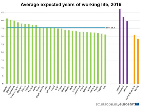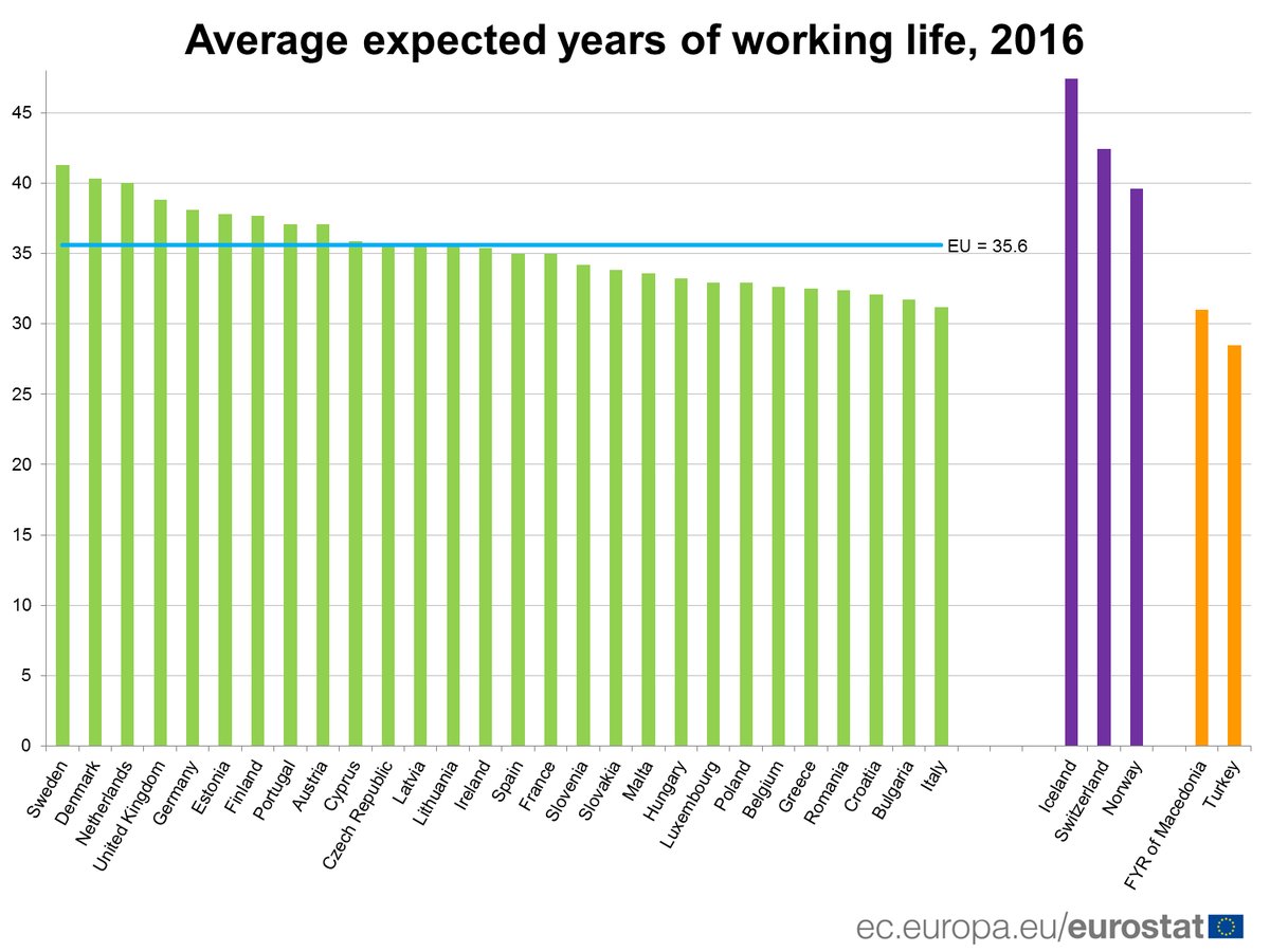 Quanto lavorano gli europei. Eurostat ha rilasciato dei dati molti interessanti sulla durata prevista della vita lavorativa nei diversi paesi dell’Ue all’anno 2016.