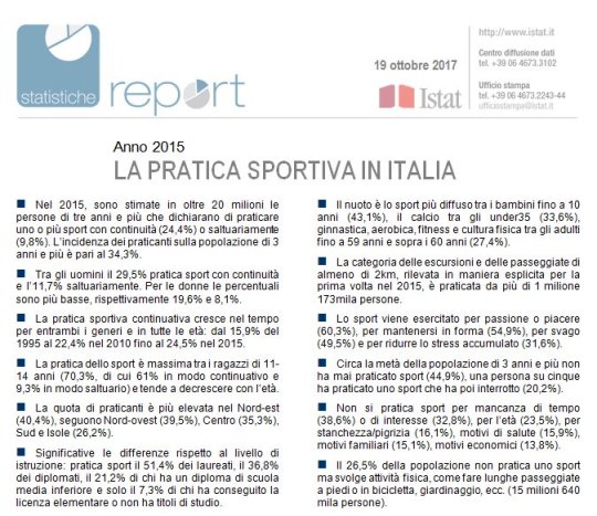 Mi agito svogliato fra grafici e tabelle dall’aria defatigante fino a che pure oggi non mi arriva l’Istat in soccorso. Il mio istituto preferito lancia uno di quegli argomenti perfetti per l’aperitivo del pomeriggio, da affrontare dopo il primo cicchetto e l’immancabile boccata di nicotina: gli italiani e lo sport.