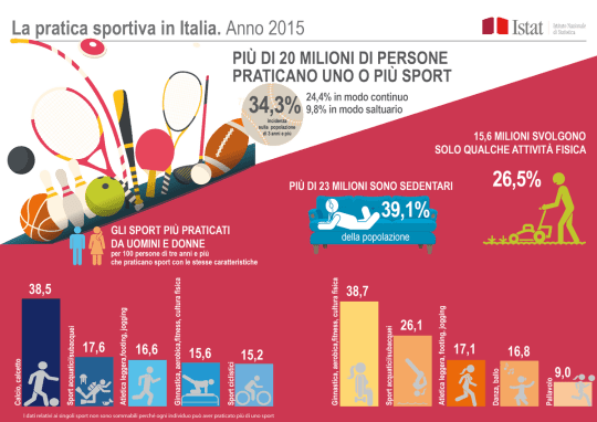 M’interrogo se avere un italiano su tre che si agita facendo sport, e addirittura uno su quattro che lo fa regolarmente, faccia di noi una popolazione atletica, anche se certo, quel 39,1% di sedentari non è che deponga a nostro favore.