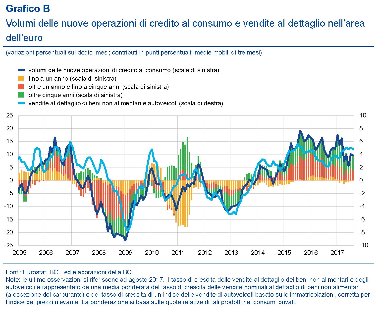 Il credito al consumo viene principalmente utilizzato per finanziare l’acquisto di articoli dal prezzo considerevole come mobili, elettrodomestici e autoveicoli. Queste dinamiche sono state sostenute dalle accomodanti misure convenzionali e non convenzionali di politica monetaria della BCE che, in associazione alla ripresa economica, hanno notevolmente ridotto il rischio di credito dei prenditori, contribuendo in tal modo alla crescita dell’offerta di credito e all’allentamento dei criteri di erogazione dello stesso.