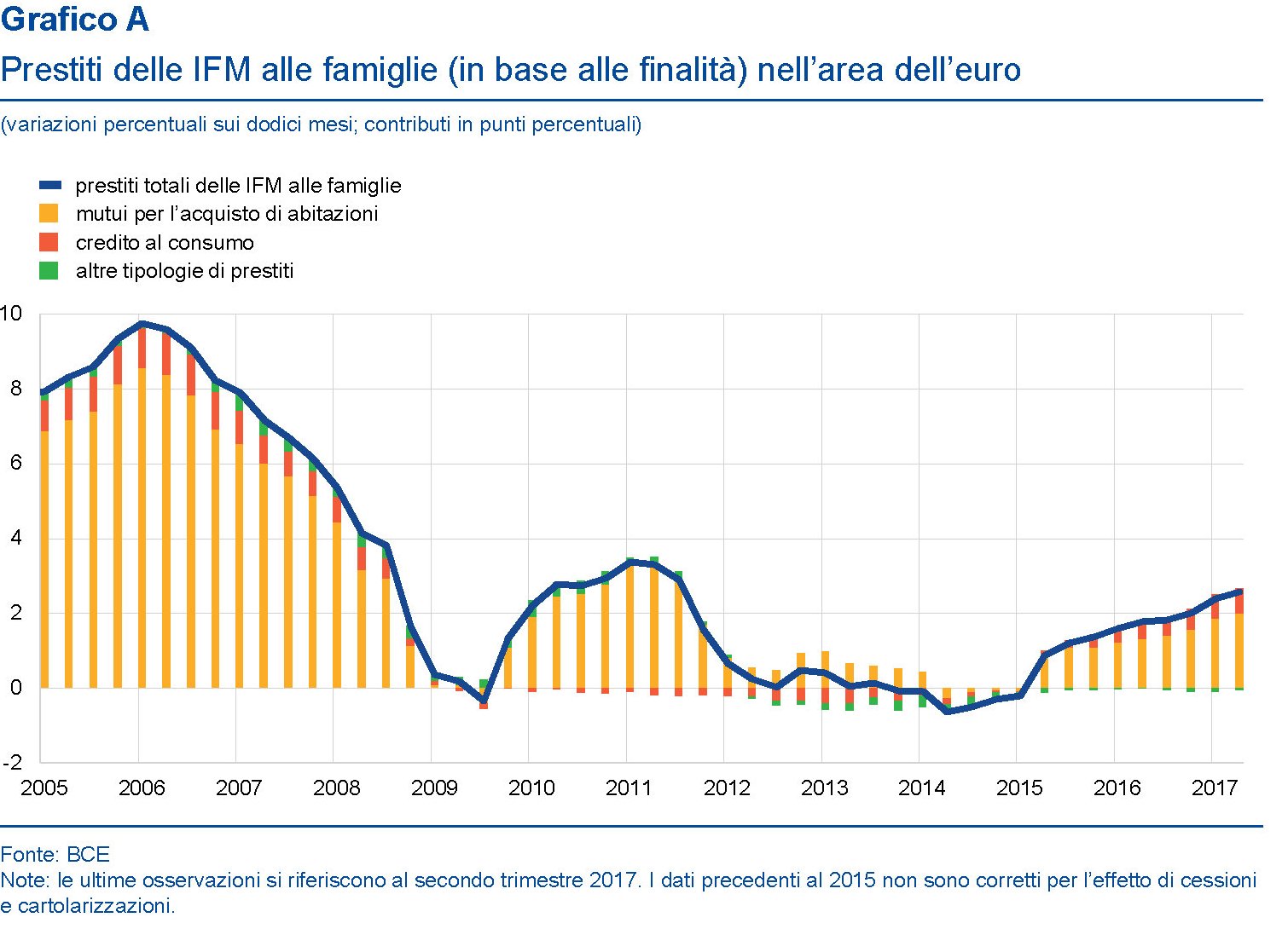 Il credito al consumo in Europa. Negli ultimi mesi, il tasso di crescita annuale dei prestiti totali concessi alle famiglie si è rafforzato ulteriormente nell’area dell’euro, ma la parte del leone la fanno i mutui. Il contributo apportato dal credito al consumo alla crescita complessiva dei prestiti alle famiglie rimane contenuto e inferiore ai livelli pre-crisi, sia perché il credito al consumo costituisce una quota relativamente modesta dei prestiti totali alle famiglie, e poi perché i mutui per l’acquisto di abitazioni, che costituiscono il 75 per cento dei prestiti totali concessi alle famiglie dalle IFM, hanno continuato ad aumentare negli ultimi anni.