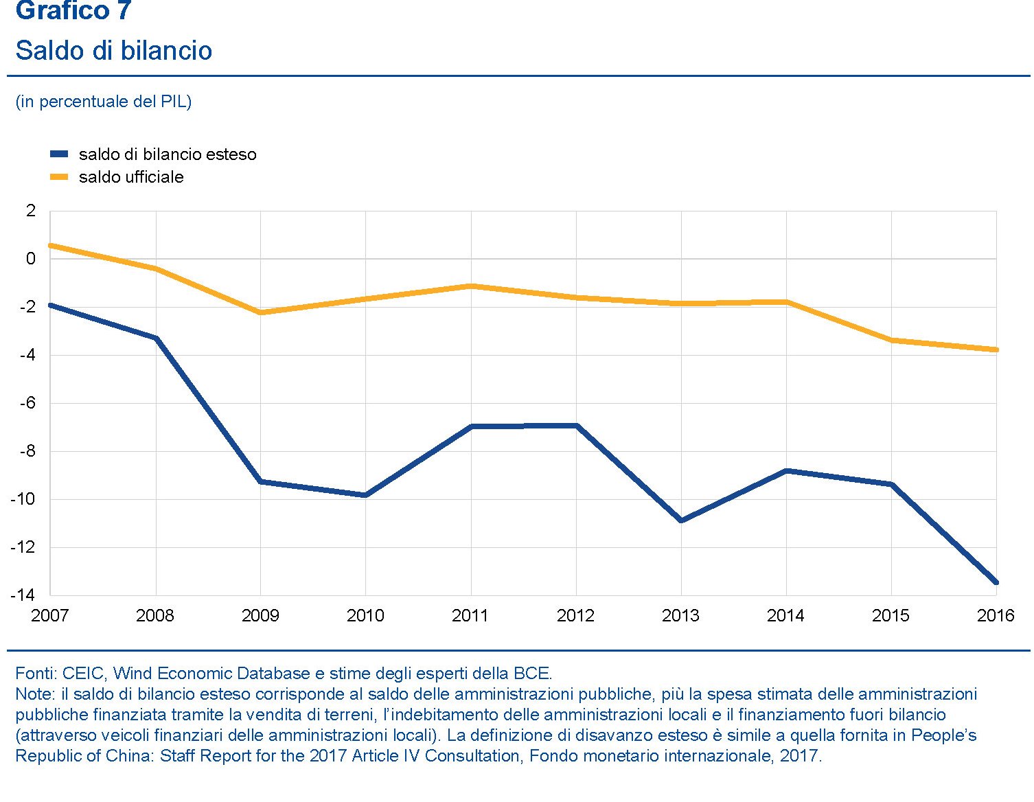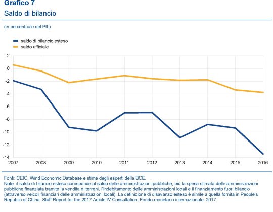 La Cina ha il rapporto credito/pil più alto fra i paesi censiti e buona parte di questo credito, che poi è un debito per chi l’ha ricevuto, è in capo alle aziende. La crescita si osserva particolarmente ripido dalle seconda metà degli anni Dieci e trova la sua ragione nell’ampio programma di stimolo impresso all’economia e fondato sugli investimenti, che il governo ha imposto al paese per assorbire lo shock post 2008. Ora la Cina sta cercando un modello di sviluppo più equilibrato, quindi meno basato sugli investimenti, ma si tratta di un percorso lungo e denso di incognite. Nel frattempo sono rimasti i problemi. E il debito è un di questo. Anche il settore pubblico ne soffre assai più di quanto dicano le statistiche ufficiali. Buona parte di questo debito, infatti, è implicito, allocato presso veicoli formalmente slegato dal settore pubblico, ma sostanzialmente ad esso connessi. La Bce propone anche una stima del deficit fiscale “esteso”, ossia al lordo di queste componenti.