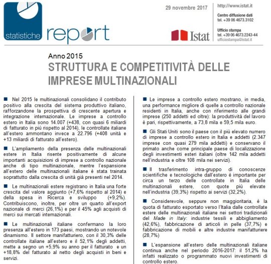 Oppure uno può dirla con l’Istat, secondo la quale ” le multinazionali consolidano il contributo positivo alla crescita del sistema produttivo italiano, rafforzandone la prospettiva di crescente apertura e integrazione internazionale. Le imprese a controllo estero in Italia sono 14.007 (+438, con quasi 6 miliardi di fatturato in più rispetto al 2014), le controllate italiane all’estero ammontano invece a 22.796 (+408 unità e +13 miliardi di fatturato all’estero).