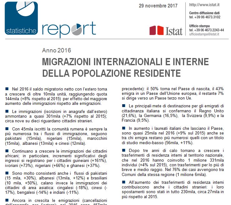 Questo è il quadro: bene che vada, in Italia si strappa un contratto a termine di questi tempi. Ma fin qui siamo alla visione monoculare. Proviamo ad aprire l’altro occhio e guardiamo un’altra statistica, quella sulle migrazioni della popolazione residente uscita proprio ieri.