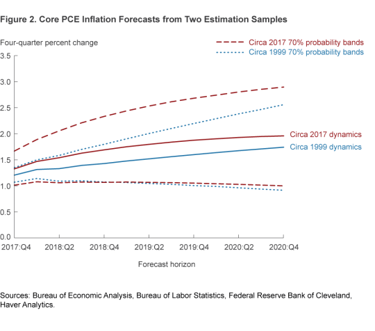Per svelare il mistero invece è stato costruito un modello che costruisce due set di dati di previsioni. La prima basata sul comportamento più recente dell’inflazione e del tasso di disoccupazione. Nel secondo set di dati invece si presume che l’inflazione sia governata dai fattori già visibili nei tardi anni ’90, quando sia la disoccupazione che l’inflazione erano basse, pure se ancora le dinamiche inflazionistiche non erano sensibili alle conseguenze della globalizzazione e della tecnologia (si pensi al commercio elettronico ai giorni nostri) come lo sono oggi. Sulla base di questi assunti sono state tratte delle previsioni per i prossimi tre anni.