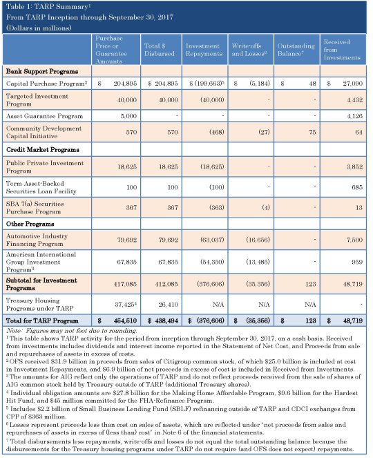 Per capire come sia andata a finire ciò vale la pena leggere l’ultimo Agency financial report pubblicato per l’anno fiscale 2017 dall’Office of financial stability statunitense, creato insieme al Tarp, dedicato proprio ai rendiconti dell’operazione.