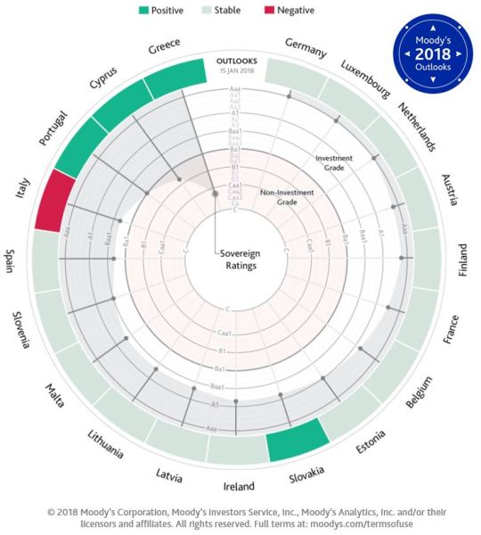Siccome la sfiga ci vede benissimo, come ricorda il contro-proverbio sulla fortuna cieca, mi sorprendo poco osservando come la notizia che a novembre il debito pubblico italiano sia sceso (per modo di dire) di 14,7 miliardi, collocandosi all’invidiabile livello di 2.275 miliardi, esca in contemporanea con il vaticinio di Moody’s dedicato ai debiti sovrani dell’eurozona, che esibisce questa perla.
