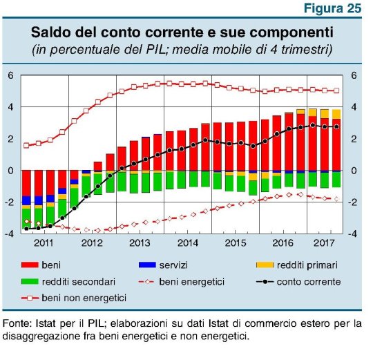 Come si può osservare il saldo del conto corrente (linea nera) si è stabilizzato a poco meno del 3% sul pil da circa un anno. A questa stabilizzazione ha contribuito il saldo dei redditi primari, cresciuto nel corso del 2017, che ha compensato la diminuzione del saldo delle merci. Su quest’ultimo ha sicuramente pesato l’aumento della nostra bolletta energetica (linea rossa tratteggiata con i rombi) che come si può osservare si avvia a pesare il 2% del pil e peggiora da fine 2016, quando l’Opec e la Russia hanno inaugurato la politica dei tagli. Col petrolio ai livelli attuali non c’è da aspettarsi miglioramenti. Noterete che nel 2012 questa bolletta pesava il 4% del pil e se guardate alle quotazioni potete anche farvi un’idea di che livello di prezzi serve per arrivare grossomodo a questo risultato.