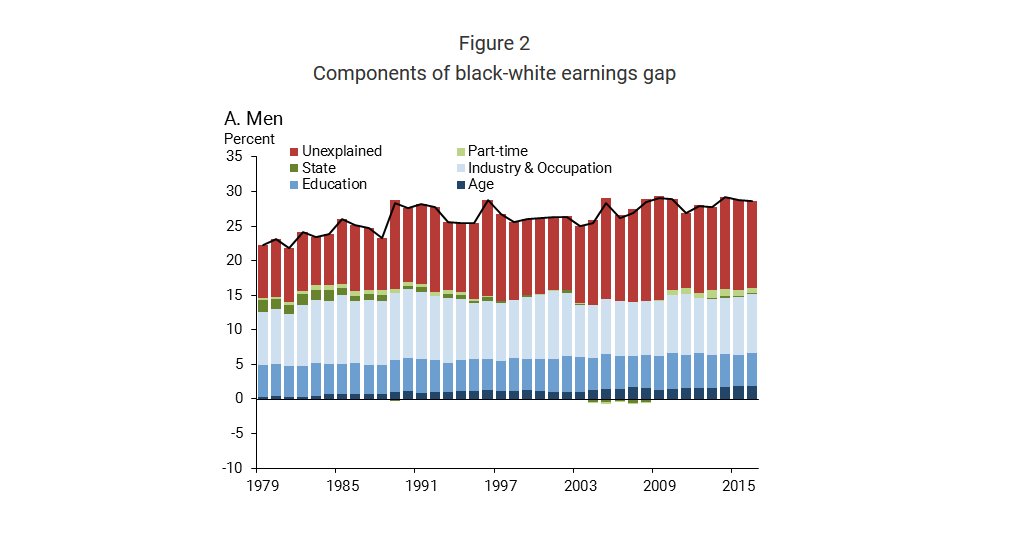 Il razzismo è esecrabile certo, e chi parla di razze è quantomeno un nostalgico con pochi fondamenti nella realtà, come ricorda a ogni pie’ sospinto il bon ton della conversazione pubblica. Perciò è sempre più misteriosa la ragione per la quale, negli Stati Uniti, esista un notevole gap fra le paghe orarie dei lavoratori bianchi e quelle dei lavoratori di colore. Gli economisti della Fed di San Francisco ci hanno messo le migliori intenzioni per spiegare questa differenza, che per i lavoratori maschi pesa circa cinque dollari, sulla paga oraria media reale, e prosegue almeno dal 1979. In sostanza, le retribuzioni per i neri sono un quarto più basse di quelle dei bianchi. Gli osservatori hanno scomodato tutte le spiegazioni che offre l’economia: le differenze territoriali, quelle di istruzione, la diversa quota di lavori part time e persino l’età o l’industria di riferimento. Ma ciò che hanno osservato con sconcerto è stata la crescita costante nel tempo dell’istogramma rosso, quello che bolla come unexplained – senza spiegazione – tale differenza e che ormai pesa una buona parte di questo gap. Inspiegabile, visto che le razze non esistono e nessuno oggi si può sospettare di praticare il razzismo. Nessuno a parte il denaro.