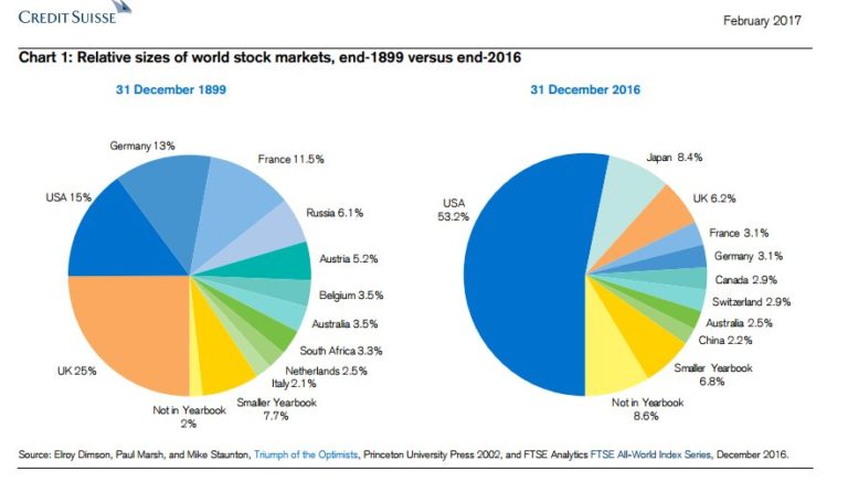 Figuratevi adesso a chi importa che Bitcoin faccia il botto in un momento in cui la borsa Usa prende uno schiaffone di oltre il 4% come quello di ieri che non si vedeva dai bei tempi bui della crisi. Nel caso vi domandaste perché i timori e i tremori della borsa Usa si comunicano con la velocità dei terremoti all’Europa e all’Asia, che stamane hanno scavato dei bei buchi nella loro capitalizzazione, date un’occhiata a questo grafico. E’ del 2017 ma rende l’idea.
