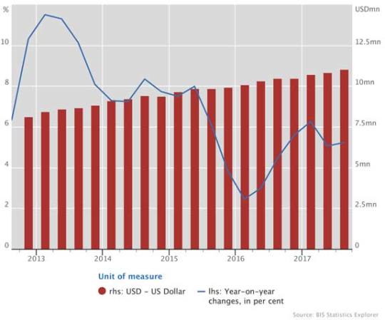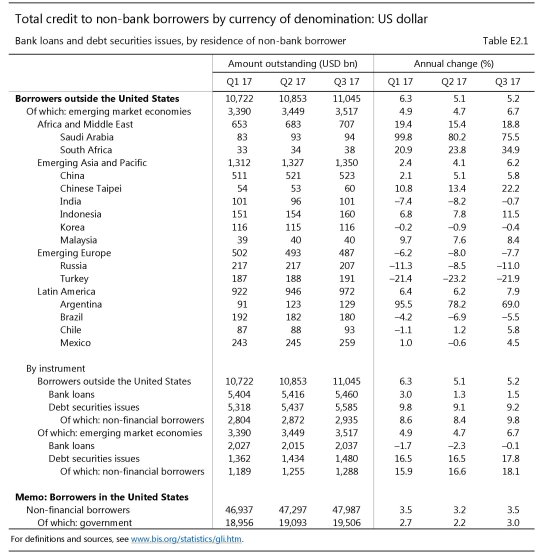 In particolare lo studio osserva la relazione fra la forza del dollaro, i flussi transfrontalieri di credito bancario e gli investimenti reali. Gli autori hanno svolto alcuni esercizi empirici al termine dei quali hanno riscontrato che un rafforzamento del dollaro è associato con una crescita minore dei prestiti bancari internazionali denominati nella valuta Usa e a una diminuzione degli investimenti reali nei paesi emergenti. Come si può osservare dalla tabella, che riporta le statistiche bancarie nei primi tre quarti del 2017, i prestiti in dollari verso le economie emergenti, Cina in testa, sono cresciuti regolarmente. E nel 2017 è noto che il dollaro si è molto indebolito nei confronti delle principali valute.