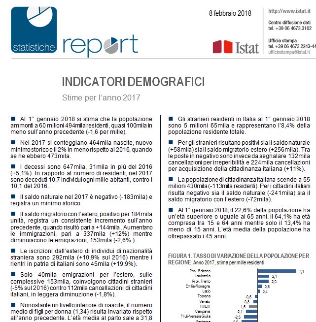 Ricapitolo perché magari qualcuno fraintende. La popolazione è diminuita di 100 mila unità, nel 2017, e la nascite sono al minimo storico, decresciute anch’esse del 2% rispetto all’anno prima. L’età media del parto si è allungata ancora e ormai sfiora i 32 anni. Gli immigrati, che ormai sono circa cinque milioni, hanno limitato il calo della popolazione, visto che il saldo naturale dei cittadini italiani, ossia la differenza fra il numero dei nati vivi e i morti, è negativo per 241 mia unità, così come anche il saldo migratori degli italiani con l’estero (-72 mila).