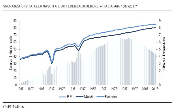 E per concludere in bellezza, ricordatevi queste cifre: “Al 1° gennaio 2018, il 22,6% della popolazione ha un’età superiore o uguale ai 65 anni, il 64,1% ha età compresa tra 15 e 64 anni mentre solo il 13,4% ha meno di 15 anni. L’età media della popolazione ha oltrepassato i 45 anni”. Ora, non so a voi, ma a me sembra già un miracolo che un paese dove più di un su cinque è ultrasessantacinquenne cresca all’unovirgola. E temo che quest’andazzo dovremo pure farcelo piacere, visto che non s’intravedono spiragli di miglioramenti possibili. Anzi no, uno c’è: migliora la speranza di vita alla nascita. Guardate questo grafico che è il segnale più evidente del progresso.