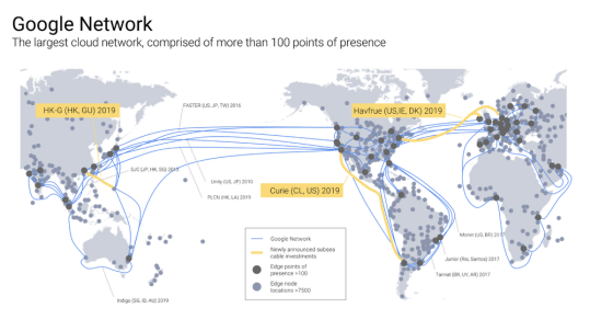 Tutto ciò abbisogna di infrastrutture per essere condotto e valorizzato. E gli esperti hanno ormai chiara la convenienza dei trasformatori/venditori di dati, chiamiamoli così, a diventare anche padroni delle reti sulle quali viaggiano i loro treni carichi di informazioni. Questa non è una semplice tendenza, ma una realtà ormai consolidata. L’evoluzione della rete di cavi sottomarini ormai è costante e sempre più complessa nel suo articolarsi, con relazioni sempre più complesse fra le aziende che animano questa rivoluzione silenziosa e gli stati che in qualche modo vi partecipano. E ciò che di nuovo si osserva è la presenza, sempre più frequente, dei giganti di Internet. Le ultime notizie dal mondo sottomarino raccontano, ad esempio, di Google che ha lanciato il progetto Curie, il primo cavo sottomarino totalmente privato (ossia di sua proprietà) che collegherà Los Angeles al Cile. Un progetto che segue di pochi mesi un altro, parimenti ambizioso, che vede stavolta Google in consorzio con altre entità, fra le quali c’è anche Facebook per la posa del cavo Havfrue, che in danese significa Sirena, un gigante da quasi 9.000 km, progettato per collegare il New Jersey con la Danimarca e l’Irlanda, con la possibilità di estendersi fino alla Norvegia. Il primo da quasi vent’anni che viene realizzato per collegare queste due parti del mondo. Il cavo, dove i dati viaggeranno a 108 Tbps, dovrebbe essere operativo per la fine dell’anno prossimo, aggiungendosi alla già fitta rete di cavi, ormai oltre 400, che affolla in fondali oceanici. La presenza di Google, che è attiva nel settore da un decennio, non è certo casuale. La stessa compagnia ne ha spiegato le ragioni nel suo blog, mostrando come ormai la compagnia californiana sia un realtà più che consolidata nel business della rete sottomarina, essendo presente in qualità di investitore in ben undici progetti.