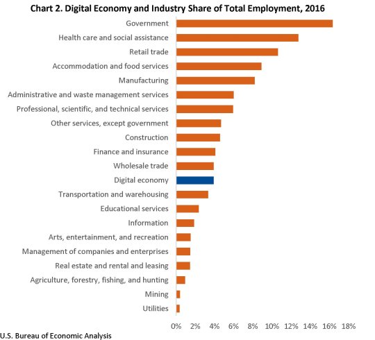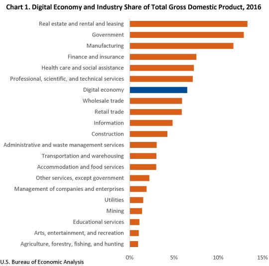 Come si può osservare, l’economia dei bit ormai ha un peso specifico rilevante nella composizione del pil, pari al 5,9%, che equivale a 1.102 miliardi di produzione in dollari correnti. Ma il secondo grafico aggiunge un altro elemento.